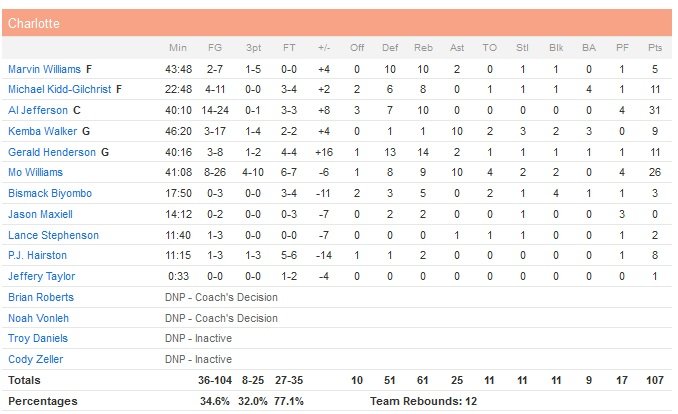 Un mano a mano s’engage ensuite entre les deux meneurs, qui s’échangent les 3-points en première prolongation sans pour autant permettre à leur équipe de prendre l’avantage. À 101-101 après un layup de Williams, 46.8 secondes vont dérouler sans le moindre panier. Face à la réussite de Jefferson en seconde prolongation, Wall plante le shoot du match pour donner trois points d’avance à son équipe (110-107) à 9.9 secondes du buzzer final alors que Williams et le pivot des Hornets rateront leurs dernières tentatives de loin dans les dernières secondes.