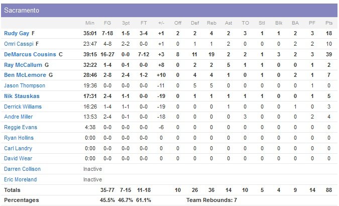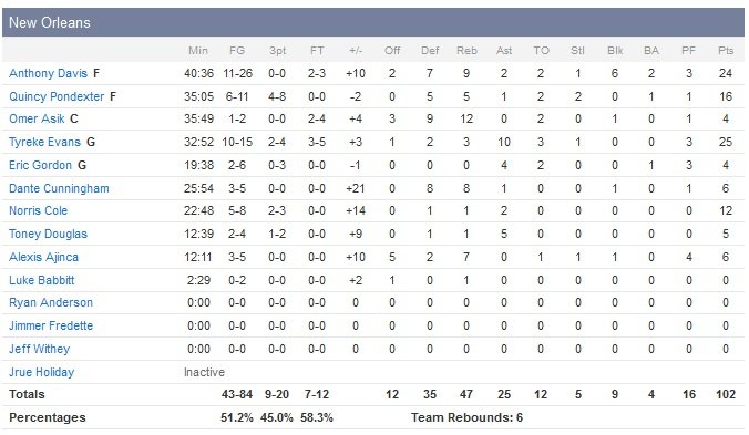 Le match énorme de DeMarcus Cousins (39 points et 20 rebonds) n’aura donc pas suffi à Sacramento (dominé 47-37 au rebond), qui voit sa série de 4 victoires stoppée. Rudy Gay termine lui à 18 points. Cousins signe 23 points 9 rebonds et 2 contres dans la seule première mi-temps mais ce n’était déjà pas suffisant pour assurer une avance aux siens. New Orleans a transformé 10 rebonds offensifs en 13 points sur les deux premiers quarts. Menés par les 11 points d’Evans et les 10 points de Pondexter, les Pelicans (9/20 de loin sur le match) sont devant 46-42 à la pause.
