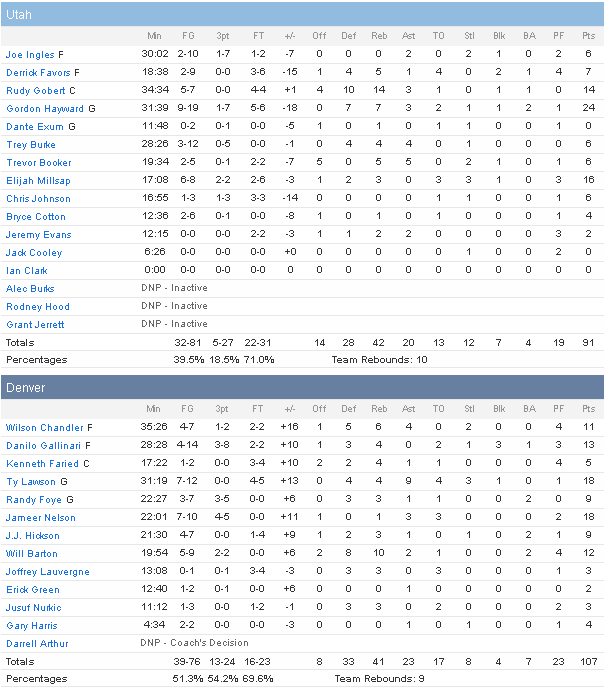 Les Nuggets se sont appuyés sur leur doublette de meneurs Ty Lawson – Jamer Nelson, auteurs tous les deux de 18 points. Ils ont mené de main de maître l’attaque des Nuggets face à la solide défense du Jazz, pour une réussite générale d »équipe de 51.3% dont un 13/24 à trois points, contre seulement 39.5% au Jazz, en grande difficulté offensivement, notamment en première mi-temps. Avec l’aide de Danilo Gallinari (13 points), Will Barton (12 points) et Wilson Chandler (11 points), Denver a fait la course en tête de bout en bout. Ils ont débuté sur un 15-8 et après un retour du Jazz en fin de quart grâce à Gordon Hayward (24 points), Denver a pris le large en second quart, profitant de gros passages offensifs et des gros soucis du Jazz pour trouver le chemin du panier. Ils ont ainsi passé un 13-0 puis un 10-0 qui leur ont donné jusqu’à 16 points d’avance et finalement 13 à la pause.