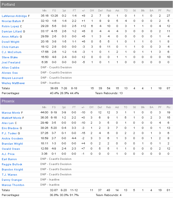 Phoenix peut s’en vouloir d’avoir laissé échapper ce match important dans la course aux playoffs puisqu’après un premier quart qu’ils ont mal terminé (29-21 Portland), ils ont dominé dans les deux suivants, profitant de l’extrême maladresse de leurs adversaires, limités à 31 points à 12/48. Ils ont ainsi pris jusqu’à 8 poins d’avance en dernier quart suite à un 9-0 en fin de troisième qui les avait fait passer devant. Le 6/23 aux tirs leur a finalement été fatal alors que Aldridge prenait lui feu dans le money time.