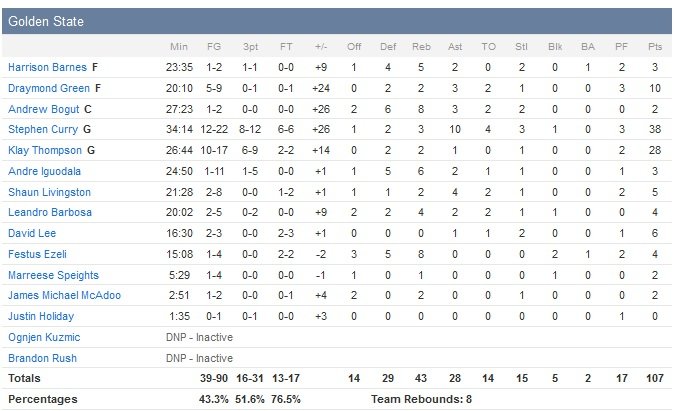 Les Splash Brothers combinent ainsi pour un 22/39 aux tirs et un 14/21 derrière l’arc (16/31 pour Golden State). Alors forcément, les 16 points de Mike Conley et Jeff Green paraissent bien fades à côté. Marc Gasol et Zach Randolph n’ont pas non plus eu leur mot à dire avec respectivement 13 et 10 points, alors que Memphis perd un deuxième match d’affilée après leur lourde défaite contre Cleveland, mercredi. Et les Warriors n’ont pas seulement dominé grâce à leur adresse extérieure cette nuit. Ils prennent ainsi l’avantage 43-30 au rebond, tout en convertissant 19 ballons perdus de leurs adversaires en 32 points. Memphis est parvenu à forcer quelques pertes de balles en première mi-temps sans pour autant réussir à les convertir en points de l’autre côté. En difficulté dans la peinture, les joueurs de Dave Joerger laissent les Warriors prendre 14 points d’avance dans le deuxième quart après avoir raté ses 7 premiers shoots de la période. Les Grizzlies se reprennent avec un 16-3 dans les minutes qui suivent mais cela n’empêche pas Golden State d’être toujours en tête, 54-49, à la mi-temps (15 points de Curry et 14 de Thompson).