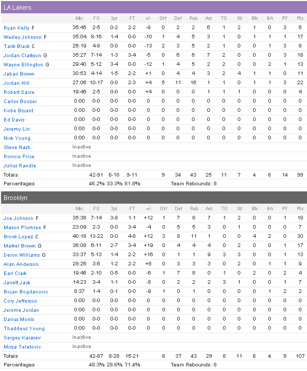 Brooklyn s’est compliqué la tâche puisqu’après un tir à trois points de Jarrett Jack qui leur a donné 14 points d’avance, ils ont baissé de rythme, laissant une nouvelle fois les Lakers revenir. Les Lakers ont enchaîné trois tirs derrière l’arc signé Wayne Ellington, Wesley Johnson et Jabari Brown en seulement 1’40 pour fondre sur les Nets, 97-92 à 7’50 du buzzer. Les Nets ont perdu leur belle circulation de la première mi-temps et les actions individuelles ont mené à une plus grande maladresse. Ils n’ont marqué qu’un seul panier en 5’30 et à 3’50 de la fin Hill a mis L.A. à 3 petits points. Après un temps mort de Lionel Hollins les Nets ont resserré la défense et se sont appuyés sur leurs cadres. Lopez et Johnson ont aligné 5 points pour se redonner un peu d’air 101-93 et 103-97 à 45 secondes de la fin.