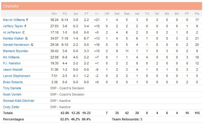 Après avoir subi trois défaites de rang, les Hornets se sont offerts une victoire importante dans la course aux playoffs contre Atlanta, premier de la Conférence Est, cette nuit sur le score de 115 à 100. Kemba Walker termine à 21 points à 7/19, 6 passes et 5 rebonds alors que ses coéquipiers Gerald Henderson (20 points à 9/10) et Mo Williams (18 points à 6/9, 4 passes) se révèlent plus adroits et donc précieux.