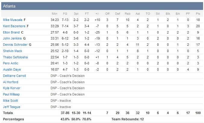Menée par les 20 points de Kent Bazemore et les double-doubles de Mike Muscala (18 points et 10 rebonds) et Dennis Schröder (17 points et 11 passes), la second (voire third) unit des Hawks ne peut éviter une troisième défaite en quatre rencontres et ce malgré un excellent pourcentage de loin (15/30). Charlotte prend l’avantage 57-52 à la pause avec 10 points en provenance de P.J. Hairston (4/4 avant la pause dont deux 3-points). Les Hornets prennent ensuite 14 points d’avance dans le sillage de Walker (9 points) dans le troisième quart-temps et va parvenir à tenir Atlanta éloigné dans le quatrième pour aller chercher leur troisième victoire seulement en 11 matchs.