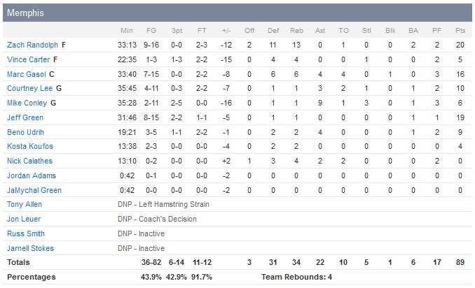 Leonard a profité un max de l’absence de Tony Allen (ischio-jambiers) dans le périmètre face à Jeff Green (19 points) ou même Kosta Koufos. Avec un 51% de réussite aux tirs, San Antonio inflige une troisième défaite de rang aux Grizzlies, menés par les 20 points et 13 rebonds de Zach Randolph. Habituellement en difficulté face à la défense physique des Texans, ce dernier shoote à 9/16 en 33 minutes. Son coéquipier All-Star Marc Gasol en revanche, a été bien mis en difficulté en début de match mais termine tout de même à 16 points à 7/15. Les locaux, en tête 51-42 à la pause, ont fait la différence dans le quatrième quart-temps, dans lequel Leonard shoote à 6/7 et Tony Parker marque 9 de ses 17 points (7/16, 6 passes). Tiago Splitter ajoute 15 points alors que Tim Duncan et Boris Diaw apportent 10 points chacun à la 6e équipe de l’Ouest (47V-26D).