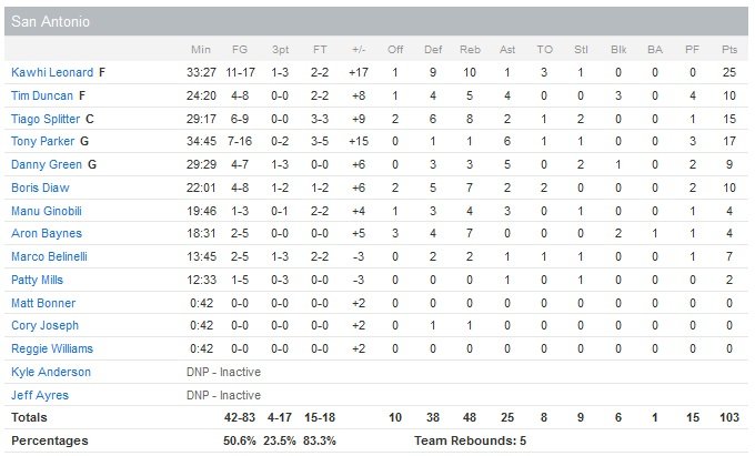 Leonard a profité un max de l’absence de Tony Allen (ischio-jambiers) dans le périmètre face à Jeff Green (19 points) ou même Kosta Koufos. Avec un 51% de réussite aux tirs, San Antonio inflige une troisième défaite de rang aux Grizzlies, menés par les 20 points et 13 rebonds de Zach Randolph. Habituellement en difficulté face à la défense physique des Texans, ce dernier shoote à 9/16 en 33 minutes. Son coéquipier All-Star Marc Gasol en revanche, a été bien mis en difficulté en début de match mais termine tout de même à 16 points à 7/15. Les locaux, en tête 51-42 à la pause, ont fait la différence dans le quatrième quart-temps, dans lequel Leonard shoote à 6/7 et Tony Parker marque 9 de ses 17 points (7/16, 6 passes). Tiago Splitter ajoute 15 points alors que Tim Duncan et Boris Diaw apportent 10 points chacun à la 6e équipe de l’Ouest (47V-26D).