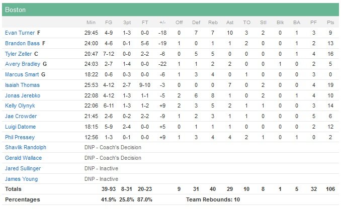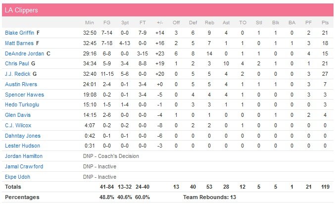 Blake Griffin ajoute 21 points et 9 rebonds alors que DeAndre Jordan signe 15 points et 14 rebonds. Matt Barnes signe lui 18 points. Isaiah Thomas est le meilleur marqueur des Celtics avec 19 points, suivi de près par Tyler Zeller (16) mais le match sera à sens unique. Les Clippers prennent un départ canon avec deux shoots à 3-points convertis par Redick et Barnes sur les deux premières possessions. La deuxième mi-temps démarre sur les mêmes bases avec un 3-points pour Barnes et Redick durant un 14-4 en faveur des visiteurs qui leur permet de mener 82-51. Après trois quarts-temps, la sanction est déjà lourde : 105-79. L’écart ira jusqu’à 35 points en milieu de troisième quart. Boston reviendra à 111-100 (merci le hack-a-Jordan, 3/15 pour le pivot des Clippers) sur un 3-points de Gigi Datome à 4 minutes de la fin mais Los Angeles répond par un 5-0.