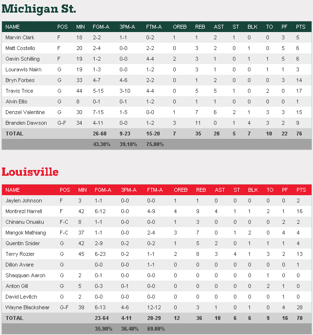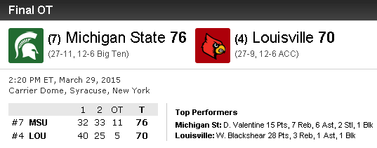 L’autre rencontre en Michigan State et Louisvile a été plus disputé puisqu’il a fallu une prolongation aux Spartans pour s’imposer. Les Cardinals avaient pourtant le match en main en première mi-temps mais leur maladresse leur a coûté cher. Mené de 8 points à la pause, Michigan State est revenu et a même fait le break sur un 10-0 qui leur a donné l’avantage 57-51 à 6’30 de la fin. Ils ont mal géré le money time et sous l’impulsion de Montrezl Harrell et Wayne Blackshear Louisville a fait son retour et a même eu l’occasion de s’imposer sur deux lancers de Mangok Mathiang à 4 secondes du terme, mais ce dernier n’en a rentré qu’un sur deux, envoyant le match en prolongation. Dans la prolongation les hommes de Rick Pitino ont shooté à 1/7 (23/64 sur le match), ce dont les Spartans ont profité. Branden Dawson a scellé le sort du match sur un rebond offensif qui a donné 4 points d’avance aux siens à 30 secondes de la fin.