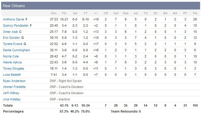 Les Wolves ont qui plus est perdu Gorgui Dieng en première mi-temps sur un coup reçu au niveau de la tête. Les Pelicans marquent les 7 premiers points du match avant de mener 25-11 en fin de premier quart, sur le 9e point de Davis obtenu sur la ligne des lancers-francs. Minnesota se rapproche dans le sillage des 8 points de Wiggins dans le deuxième et Bennett permet aux siens de recoller à 41-39. New Orleans boucle sa première mi-temps sur un 9-2, 50-41 à la pause. LaVine rentre un 3-points et enchaîne avec un dunk au retour du vestiaire (53-49) mais les Pelicans répondent cette fois par un 9-2 démarré sur un dunk d’Asik et comptant 5 points de Davis. Wiggins lancera un dernier sursaut avec 5 points durant un 7-0 en faveur des visiteurs pour revenir à moins de 10 points à la fin du troisième quart-temps mais les Pelicans gèrent parfaitement leur fin de match, permettant à Davis de se reposer.