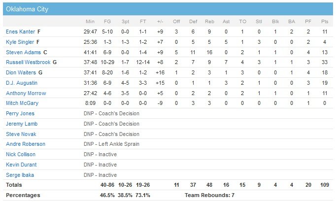 Grosse victoire du Thunder cette nuit, qui s’est octroyé un comeback rare de 20 points pour finalement battre l’un de ses concurrents directs à l’Ouest, Phoenix, 109-97. Russell Westbrook termine à 33 points à 10/29 (12/14 aux lancers-francs), 9 rebonds et 7 passes.
