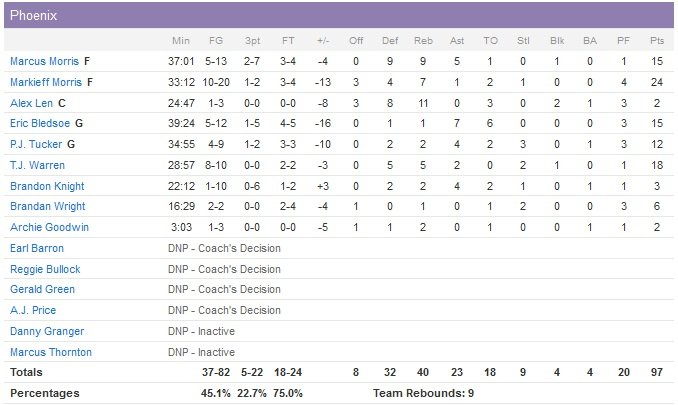 D.J. Augustin a également été précieux avec 13 de ses 19 points dans le quatrième quart-temps pour Oklahoma City, qui met fin à une série de 4 défaites à l’extérieur. Steven Adams ajoute un double-double avec 13 points et 16 rebonds et Dion Waiters 18 points. Markieff Morris termine lui meilleur marqueur des Suns avec 24 points à 10/20 et 7 rebonds mais Phoenix tombe 4 matchs derière le Thunder pour la 8e place de la conférence. T.J. Warren le rookie marque 18 points, tandis qu’Eric Bledsoe et Marcus Morris complètent avec 15 unités chacun. Son frère jumeau donne le ton en début de match et marque 4 points de plus que toute l’équipe du Thunder dans les 8 premières minutes, 16-12.