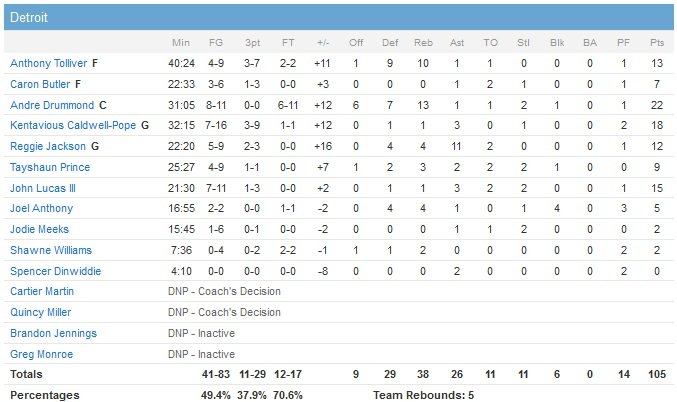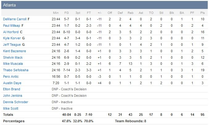 Anthony Tolliver (titulaire pour la 8e fois consécutive depuis l’absence de Greg Monroe, touché au genou) ajoute 13 points et 10 rebonds alors que Reggie Jackson, pourtant malade, termine à 12 points et 11 passes en 22 minutes. En face c’est Thabo Sefolosha qui termine meilleur marqueur de son équipe avec 19 points, suivi par Al Horford et ses 16 points à 8/11. Detroit rentre 10 de ses 11 premiers shoots de la partie (dont quatre 3-points) et prend la tête du match 25-14 en milieu de premier quart-temps. Leur série terminée, Atlanta revient à deux points, 52-50, à la mi-temps.