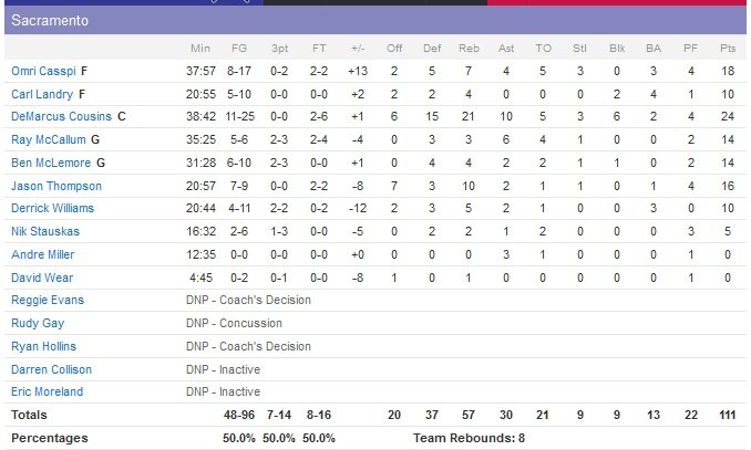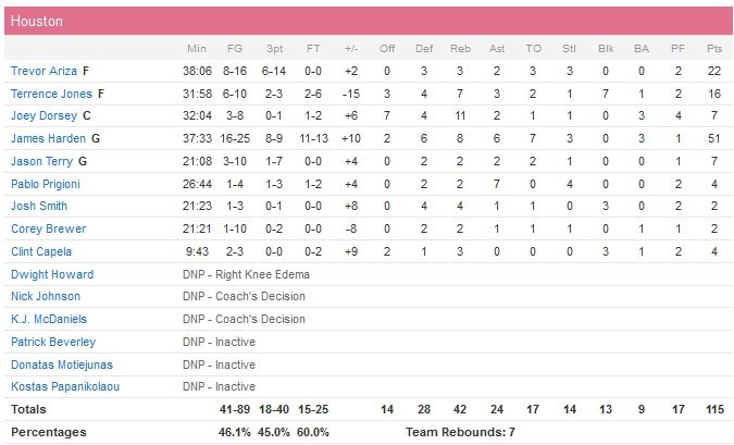 Houston était devant de 9 points à 8 minutes de la fin quand Sacramento, porté par le deuxième triple-double en carrière de DeMarcus Cousins (24 points, 21 rebonds et 10 passes mais aussi 6 contres !), passe un 9-2 pour revenir à 104-102 à 5 minutes et demi de la fin du match. Harden s’occupe de remettre son équipe dans le droit chemin durant un 8-0 (112-104) mais 4 points consécutifs des Kings (privés de Rudy Gay en raison d’une commotion subie face à Memphis) réduisent l’écart à 4 points à moins d’une minute. Finalement, la défense des Rockets résistera au coup de chaud de ses adversaires, les empêchant de marquer un nouveau panier jusqu’au buzzer.