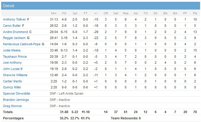 Charlotte remporte seulement son troisième match en dix rencontres et compte toujours deux défaites de plus que Brooklyn, 9e de la Conférence Est avec 33 victoires et 40 défaites. Kemba Walker et Gerald Henderson ajoutent respectivement 17 et 14 points pour les Hornets. Al Jefferson, qui a subi un drainage au genou pour la troisième fois en 8 jours avant le match, signe 11 points et 9 rebonds. Les Pistons, menés par les 15 points de Jodie Meeks, ont été rapidement gênés par les fautes d’Andre Drummond (13 points et 9 rebonds). Detroit, qui restait sur 5 victoires en 6 matchs, a shooté à un petit 35.2% et n’a rentré que 5 de ses 22 tentatives à 3-points, contre 42.2% et 9/22 pour les Hornets.