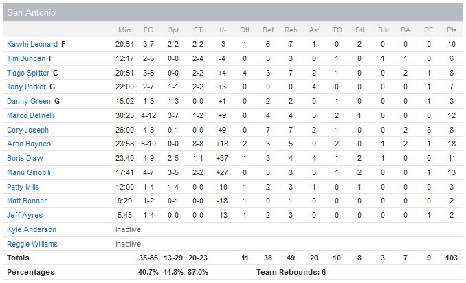 Jouant un second match de back-to-back, les Spurs ont pu reposer Tim Duncan, titulaire mais qui n’a joué que 12 minutes pour 6 points. Tony Parker signe lui 7 points à 2/7 et 4 passes en 22 minutes. Orlando prend brièvement trois points d’avance dans le premier quart avant d’encaisser un sévère 20-2 qui permet à San Antonio de mener 36-21 après 12 minutes de jeu. Les Spurs shootent à 8/15 sur la série (quatre 3-points) pendant que le Magic ne rentre qu’une de ses 11 tentatives tout en perdant 4 ballons sur la même période.