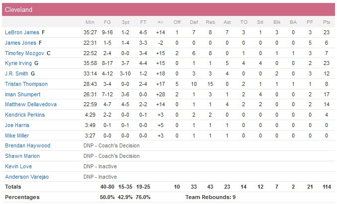 Miami va trainer une grosse dizaine de points de retard de la mi-temps (60-51) jusqu’à la fin du troisième quart-temps, où les Cavaliers vont leur infliger un 8-0 décisif marqué par un 3-points de J.R. Smith dans lse dernières secondes et qui porte le score à 91-72. À noter que sur son premier panier du match, LeBron James a pris la 20e place de Patrick Ewing au classement des meilleurs marqueurs de l’histoire de la ligue. Il n’avait besoin que d’un point (24 815 points pour l’ancien Knick).