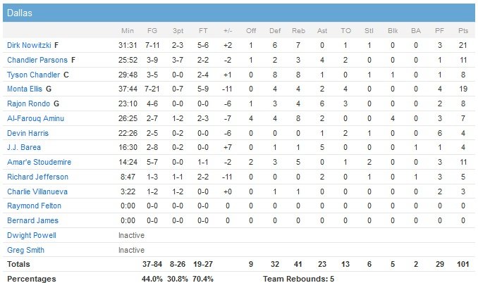 Lui et un autre ancien membre des Mavericks l’année du titre (2011), Corey Brewer, ont fait mal à leurs voisins avec respectivement 10 et 14 points. Sortants d’une victoire éreintante face à Oklahoma City hier (les Rockets eux aussi avaient joué la veille avec un succès contre Sacramento), Dallas, mené par les 21 points de Dirk Nowitzki et les 19 points de Monta Ellis, a manqué de fraîcheur. Les Rockets ont retenu leur souffle lors de la sortie de Dwight Howard sur blessure dans le troisième quart-temps suite à un contact genou à genou. Le pivot est finalement revenu pour le début du quatrième quart-temps et signe 8 points à 3/7 et 7 rebonds en 18 minutes de jeu. Dallas a de son côté perdu Chandler Parsons (11 points à 3/9, 4 passes et 3 rebonds) dans le troisième quart, lui aussi pour des douleurs au genou (droit).