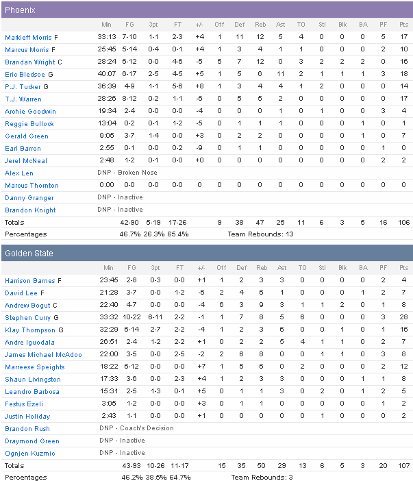 Même si c’est Harrison Barnes qui est le héros de la soirée (il a shooté à 2/8 sur le match pour 4 points), l’homme du match pour les Warriors se nomme Stephen Curry, auteur de 28 points à 10/22 dont 6/11 à trois points (34/55 sur les 6 derniers matchs derrière l’arc) , 8 rebonds, 5 passes mais 6 ballons perdus. Seuls deux autres Warriors atteignent les 10 points: Klay Thompson (16 points à 6/14) et Marreese Speights (12 points). Les Suns ont pu compter sur 6 joueurs entre 10 et 18 points dont 18 pour Eric Bledsoe (11 passes), 17 pour Markieff Morris (12 rebonds et 5 passes) et TJ Warren, et 16 pour Brandan Wright.