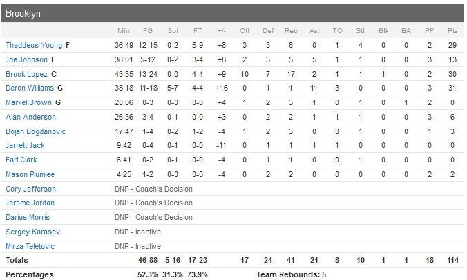 Quand Deron Williams retrouve son niveau de All-Star (31 points à 11/18 et 11 passes), que Brook Lopez continue sur sa lancée (5e match à au moins 30 points en 9 rencontres) avec 30 points et 17 rebonds et que Thaddeus Young ajoute 29 pts….pas grand chose à faire pour Toronto.