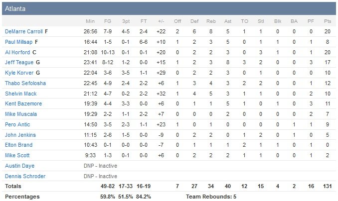 Soirée mitigée pour les Hawks, qui malgré une grosse victoire 131-99 aux dépens de l’équipe en forme du moment et pour un 57e succès cette saison (record de franchise égalisé), perdent l’un de leurs All-Stars. Paul Millsap a dû quitter ses coéquipiers sur une blessure à l’épaule après un choc avec Earl Clark en deuxième quart-temps. En son absence, Al Horford (10/13) et DeMarre Carroll (7/9) ont déroulé avec 20 points chacun.