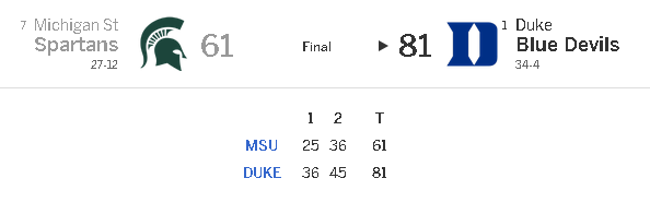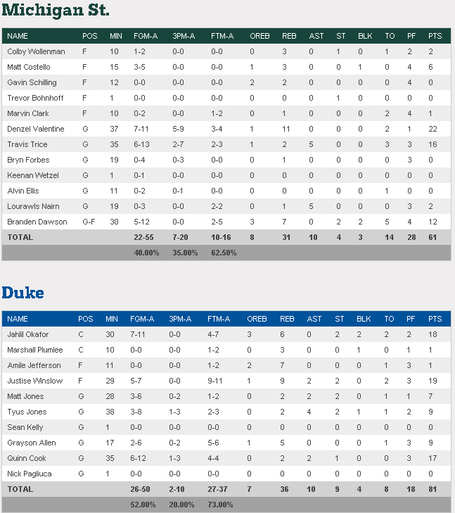 Dans l’autre match il n’y as pas eu de suspense. Après un excellent départ (14-6), Michigan State a totalement craqué, encaissant un 30-11 dans le reste de la première mi-temps. Devant de 11 points à la pause, Duke a très vite porté son avance à 20 points au retour des vestiaires, porté par le trio Jahlil Okafor (18 points), Justise Winslow (19 points) et Quinn Cook (17 points)