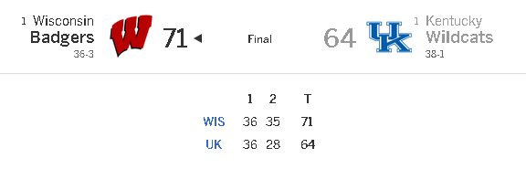 Kentucky, invaincu jusque là cette saison, ne réalisera pas la saison historique tant attendue, la faute aux Badgers de Wisconsin. Dans le sillage du meilleur joueur de la saison, Frank Kaminsky (20 points à 7/11 et 11 rebonds) les Badgers ont créé un énorme exploit en s’imposant 71-64. Tout s’est joué dans le money time puisque Wisconsin a fini le match sur un 7-1 fatal lors des 25 dernières secondes.