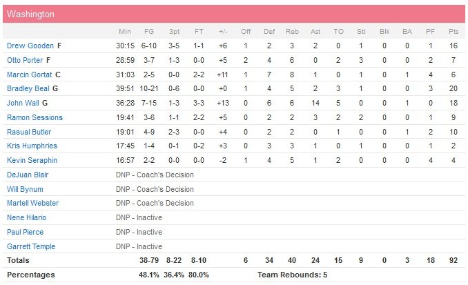 Les Grizzlies ratent 11 de leurs 14 shoots entre le premier et le deuxième quart mais n’est pas trop distancé à la pause grâce à un 0/6 des Wizards pour démarrer le deuxième quart. À la mi-temps, Washington, mené par les 12 points de Wall, est tout de même largement devant, 49-38. L’écart s’étend à 13 points dans le troisième quart-temps puis 12 à la fin de celui-ci (71-59). Memphis (qui a perdu Jeff Green sur des douleurs au dos), qui retombe à la 3e place de la Conférence Est derrière Houston, ne se rapprochera pas à moins de 7 points dans le quatrième quart.