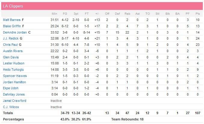 Menés par un trio de feu J.J. Redick (24 points à 8/17), DeAndre Jordan (14 points et 22 rebonds) et Chris Paul (23 points et 9 passes), les Clippers sont repassés devant San Antonio à la 5e place de la Conférence Ouest pour leur 9e victoire en 10 matchs.