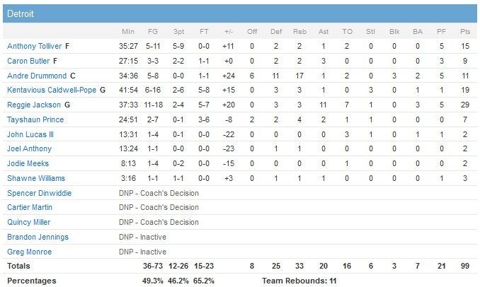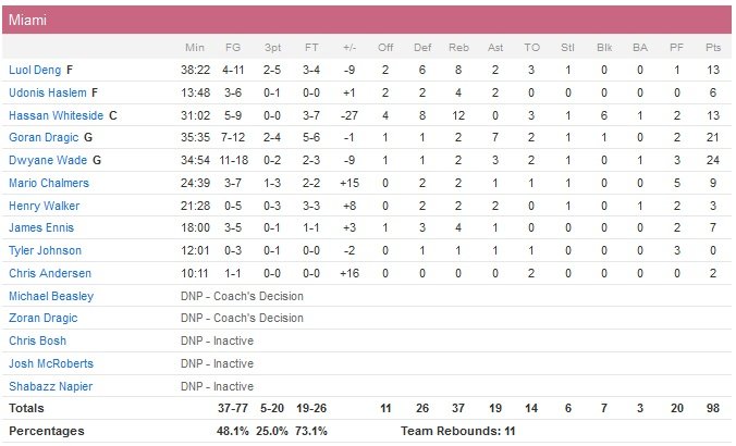 Andre Drummond a lui signé son 44e double-double de la saison avec 11 points et 17 rebonds. Kentavious Caldwell-Pope et Anthony Tolliver ajoutent 15 points chacun. En face Dwyane Wade et Goran Dragic scorent respectivement 24 et 21 points pour le Heat, qui a shooté à 48%, notamment grâce au joli 11/18 de Wade. Le même pourcentage que Jackson, dont l’équipe termine elle à 49%. Les Pistons démarrent bien leur match avec un 7/7 incluant trois 3-points pour prendre la tête 18-11 après 4 minutes de jeu. Miami va prendre le dessus dans les 20 minutes suivantes, forçant 10 ballons perdus et tenant ses adversaires à 33% de réussite. Mené de 5 points après 12 minutes, le Heat use ainsi d’un 22-6 pour passer devant 46-35 en milieu de deuxième quart. Shawne Williams permet ensuite aux siens de mener 55-50 sur un 3-points au buzzer.