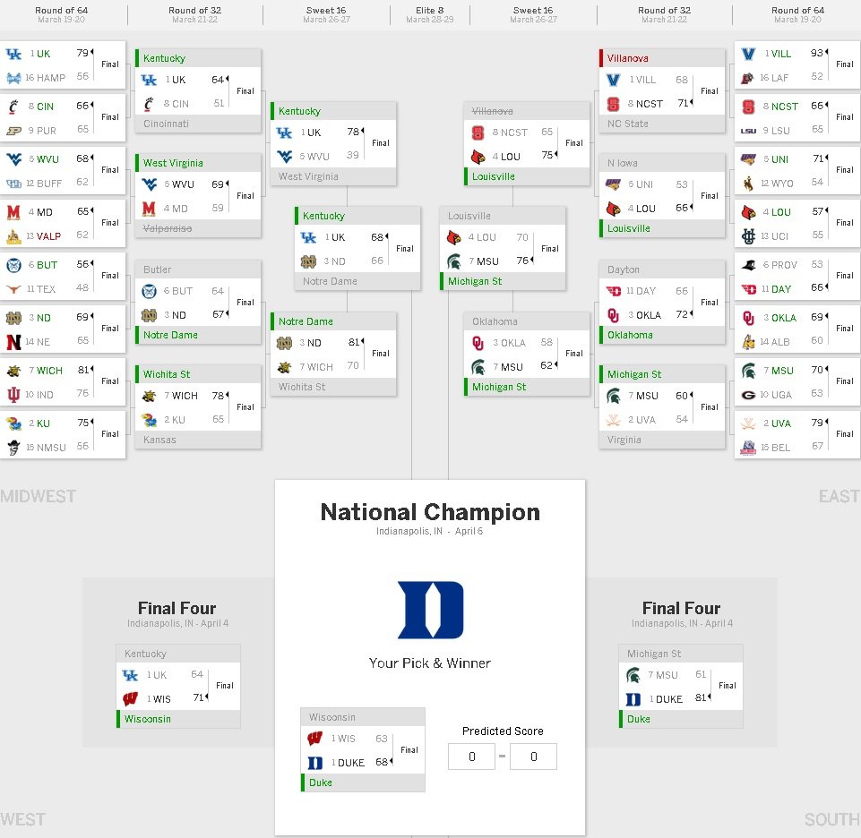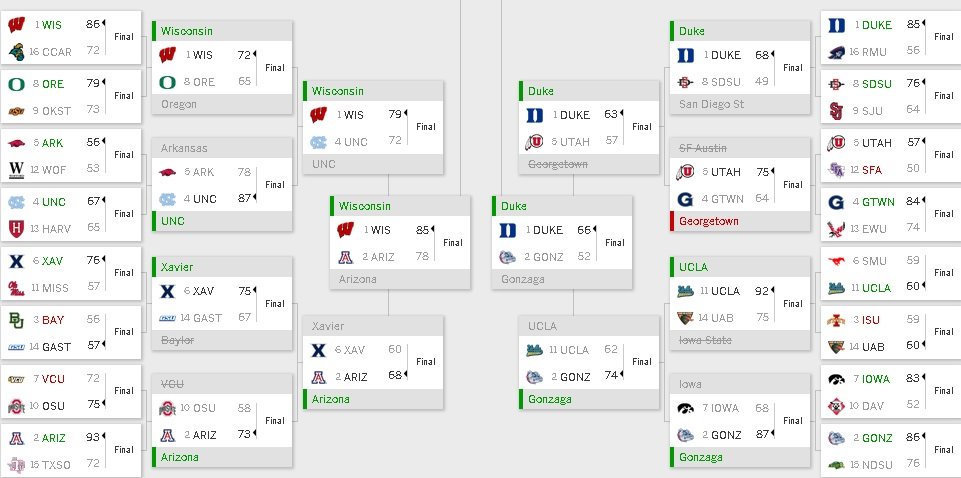 Dès le third round du tournoi final il n’y avait plus le moindre bracket en course pour devenir le premier bracket parfait de l’histoire, mais certains ont fait très peu d’erreurs. C’est le cas de Sam Holtz, 12 ans, qui a terminé meilleur bracket à égalité avec un autre concurrent, parmi 11.57 millions de participants. Il n’avait pourtant pas suivi la saison régulière.