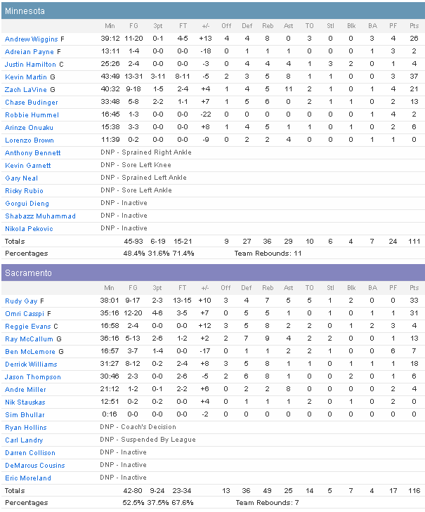 En face Kevin Martin égale son record de saison avec 37 points à 13/31 et 8 passes, tandis que Andrew Wiggins ajoute 26 points à 11/20 et /8 rebonds et Zach LaVine 21 points à 9/18 et 1 passes.