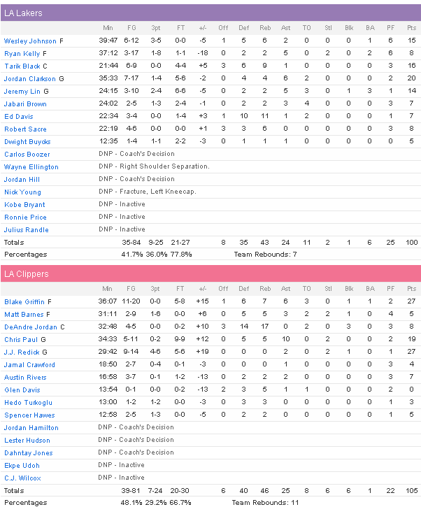 L.A. a été mené par le trio Blake Griffin (27 points à 11/20, 7 rebonds et 6 passes), JJ Redick (27 points à 9/14) et Chris Paul (19 points à 5/11 et 10 passes). DeAndre Jordan a lui contrôlé le rebond avec 8 points et 17 rebonds. Ils ont limité les Lakers à 41.7% mais ces derniers ce sont accrochés tout le match, sans jamais exploser grâce à 20 points de Jordan Clarkson, 16 de Tarik Black, 15 de Wesley Johnson et 14 de Jeremy Lin. Ils ont profité d’une second unit des Clippers toujours autant en difficulté.