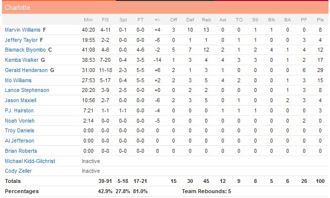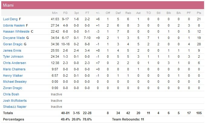 Luol Deng ajoute 21 points (9/17), Dwyane Wade 19 (6/17) et Hassan Whiteside 12 points (6/8) 8 rebonds et 1 contre. En face Gerald Henderson envoie tout ce qu’il peut (29 points à 11/18 et 3 rebonds), Kemba Walker apporte 17 points, Mo Williams 15 et Bismack Biyombo 12 points et 12 rebonds mais à domicile, Miami a réussi à faire la différence dans les moments importants pour effacer une série de 4 défaites. Désormais 9e avec seulement une défaite de plus que Boston, 8e, Miami a encore toutes des chances alors que Charlotte est 11e et devra encore se passer d’Al Jefferson pour minimum un match. Les Hornets prennent la tête du match rapidement mais le Heat répond par un 27-9 qui lui permet de prendre 10 points d’avance. Rien n’est décidé en première mi-temps puisque celle-ci se conclut sur un score de 55 partout.