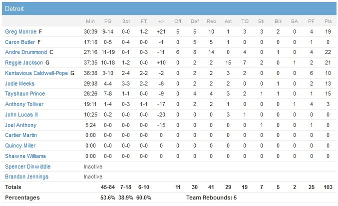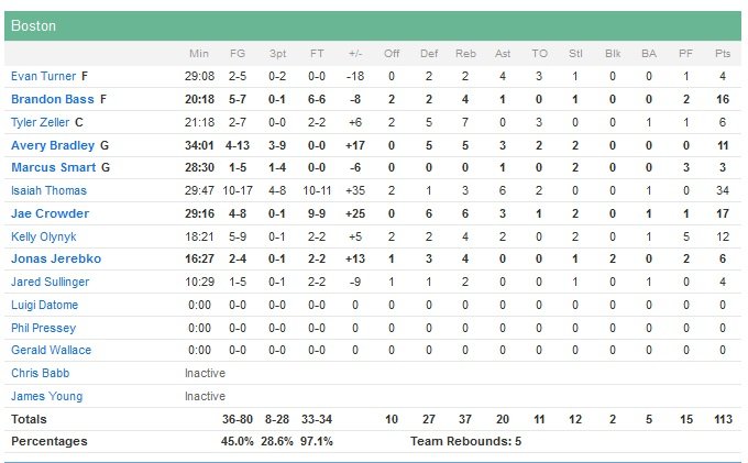 Jae Crowder ajoute 17 points pour les Celtics alors que Reggie Jackson (21 points et 15 passes), Greg Monroe (de retour après 11 matchs d’absence en raison d’une entorse du genou, 19 points et 10 rebonds) et Andre Drummond (22 points et 14 rebonds) ont tout donné pour retarder l’échéance, en vain. Boston termine fort son premier quart en inscrivant les 18 derniers points de la période pour prendre la tête 30-16. Isaiah Thomas compte alors déjà 9 points dont un 3-points au buzzer. Les Pistons reviennent au score en deuxième quart en rentrant 7 de leurs 8 premiers tirs mais Boston conserve toujours son avance 55-47 à la pause (12 points et 5 rebonds de Monroe, 11 points de Thomas et 11 de Brandon Bass).