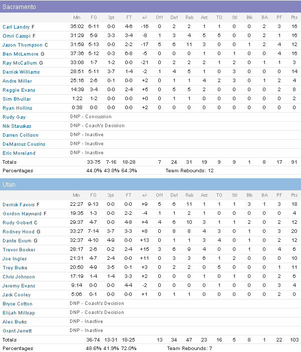 En l’absence de DeMarcus Cousins, Derrick Favors (18 points à 9/13, 11 rebonds et 3 contres) et Rudy Gobert (12 points à 4/7, 10 rebonds, 3 passes et 2 contres) ont dominé à l’intérieur. Rodney Hood a continué sur sa bonne lancée avec 20 points à 7/14, 8 rebonds et 4 passes alors que Dante Exum ajoute 12 points, Trey Burke 11 et Joe Ingles 10 (6 passes). Pas au mieux offensivement en l’absence également de Rudy Gay, les Kings n’ont pas pu faire la différence défensivement en seconde mi-temps en laissant le Jazz shooter à 48.6% dont un 13/31 à trois points et capter 13 rebonds offensifs. Carl Landy, Omri Casspi et Ben McLemore marquent 16 points chacun, Derrick Williams 12 et Jason Thomson compile 12 points et 11 rebonds.