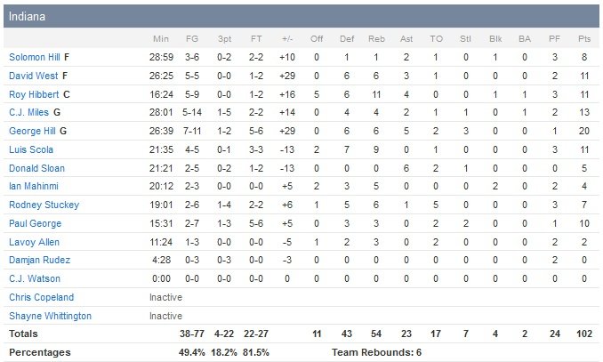 Les Knicks, portés par les 19 points de Langston Galloway, shootent ainsi à 34.5% et sont largement dominés au rebond (54-34). Indiana pose le décor en première mi-temps avec un avantage 54-38 pendant que l’équipe de Derek Fisher ne rentre que 31.7% de ses tentatives et se fait ramasser sous le cercle (31 rebonds à 18). Écrasé 83-55 après trois quarts-temps, New York s’épargne un score difficile en profitant de la mise au repos des titulaires de Frank Vogel dans les 12 dernières minutes pour finalement conclure avec « seulement » 16 points de retard. Quant à Paul George, il a joué un peu plus de 15 minutes pour son deuxième match de la saison et termine à 10 points à 2/7, 3 rebonds, 2 interceptions.