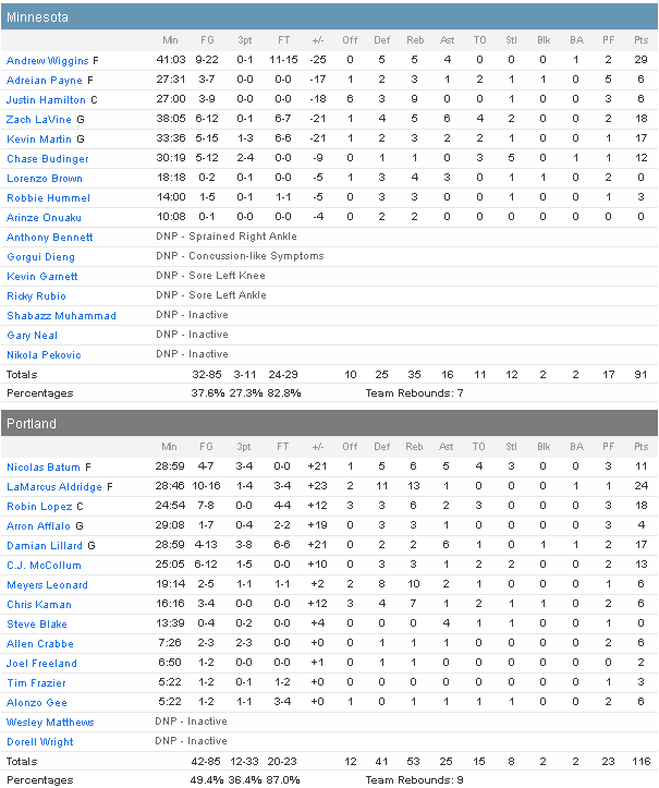 Portland a pu faire tourner son effectif après une excellente première mi-temps où ils ont réglé l’affaire. Ils ont été emmenés par LaMarcus Aldridge (24 points à 10/1 et 13 rebonds en 29 minutes), bien aidé par le duo Robin Lopez (18 points à 7/8 et 6 rebonds) – Damian Lillard (17 points ) 4/13 et 6 passes). Nicolas Batum compile lui 11 points à 4/7, 6 rebonds, 5 passes et 3 interceptions alors que CJ McCollum poursuit sur sa lancée avec 13 points. En face une nouvelle fois Andrew Wiggins a sorti son match mais n’a rien pu faire. Il termine meilleur marqueur avec 29 points à 9/22 et 11/15 aux lancers, 5 rebonds et 4 passes. Zach LaVine inscrit 18 points, Kevin Martin 17 et Chase Budinger 12. Minnesota a shooté à seulement 37.6% sur le match et a surtout été limité à 36 points à 14/44 en première mi-temps.