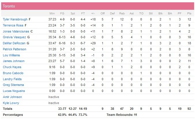 La fin de saison approche à grands pas pour les Hornets (11èmes de la Conférence Est trois matchs derrière Boston, 8ème), une nouvelle fois battus, 92-74, face aux Raptors. DeMar DeRozan (18 pts), Lou Williams (16 pts), Greivis Vasquez (16 pts) et Tyler Hansbrough (12 pts et 12 rbds) sont les artisans principaux de cette 46e victoire de l’année pour Toronto.