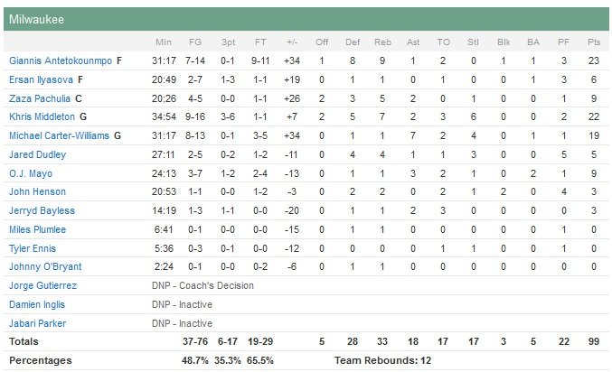 Milwaukee a de son côté l’occasion de devenir la première équipe NBA à faire les playoffs après avoir terminé la saison précédente avec le pire bilan de la ligue depuis Miami en 2008-09. Les Bucks font la différence dans le troisième quart-temps avec 11 points du Grec, qui rentre en plus un floater au buzzer. Andrea Bargnani, meilleur scoreur de New York en l’absence de Carmelo Anthony, était malade et n’a pas joué.