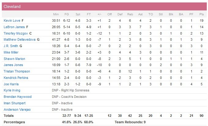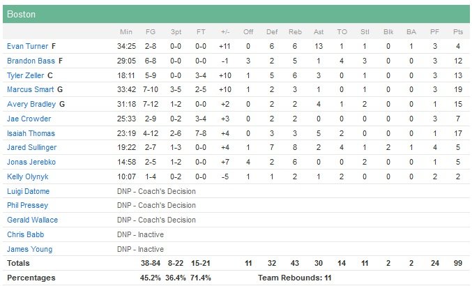 À égalité avec Brooklyn au niveau du bilan, les Celtics possèdent le tiebreaker (3 victoires en 4 matchs contre les Nets cette saison) et enchaînent un 21e succès en 33 matchs depuis le 21 février. Kevin Love inscrit 19 points pour les Cavaliers, Timofey Mozgov ajoute 13 points en 16 minutes alors que J.R. Smith ne marque pas en 19 minutes. David Blatt n’a pas fait jouer ses titulaires dans le quatrième quart-temps. Mené 60-44 en début de troisième quart, Cleveland (qui rate 8 de ses 10 premiers shoots du match) va passer un 19-6 à ses adversaires. Mike Miller donne l’avantage aux locaux 70-69 à 2″54 mais Jae Crowder redonne deux points d’avance aux siens 79-77 sur la ligne avant de jouer le quatrième quart-temps. Dans le dernier quart, marqué par la maladresse des deux équipes, Boston a fait le break en débutant par un 11-5 en 5 minutes pour mener 90-82. Avec seulement 3 paniers dans les dernières 9’30 du match Cleveland n’a jamais pu recoller.