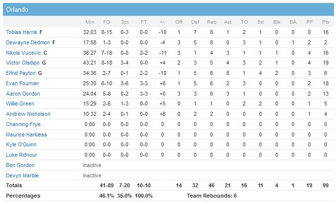 En face Victor Oladipo apporte 19 points à 8/18, 5 rebonds et 4 passes mais manque le shoot de l’égalisation dans la dernière seconde. Evan Fournier marque lui 18 points (6/10, 6 rebonds et 2 passes) pour son deuxième match depuis son retour (11 au premier), Tobias Harris et Nikola Vucevic ajoutent 16 points chacun mais Orlando perd pour la première fois en quatre matchs. Toronto prend jusqu’à 12 points d’avance en première mi-temps mais la bonne série de Fournier (trois 3-points et deux shoots consécutifs) va permettre aux locaux de prendre un court avantage avant de rejoindre le vestiaire, 51-49. Les deux équipes sont au coude-à-coude dans le troisième et reviennent à égalité 76 partout. Toronto fait la plupart de ses dégâts dans le périmètre alors qu’Orlando se concentre plutôt sur l’attaque du panier.
