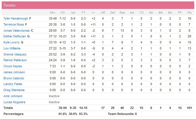 Avec 29 points de DeMar DeRozan (10/21, 5 passes et 3 rebonds) et un game winner à 3-points à 9.9 secondes du buzzer signé Lou Williams (13 points à 5/15, 4 rebonds et 2 passes), les Raptors sont venus à bout du Magic cette nuit, 101-99. Tyler Hansbrough ajoute 16 points.