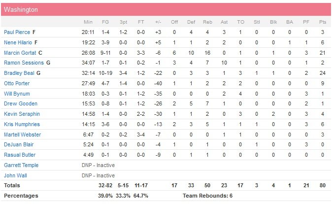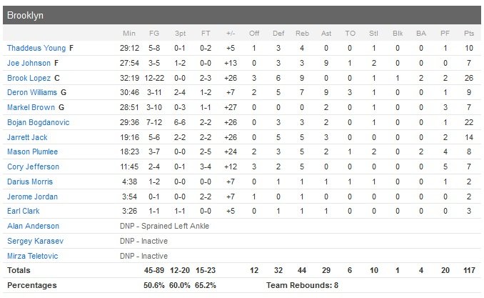 Washington (sans John Wall, laissé au repos pour le deuxième match d’affilée) voit donc sa série de 4 victoires s’arrêter net au Barclays Center et ce malgré l’énorme match de Marcin Gortat (21 points et 16 rebonds) et les 24 points de Bradley Beal mais avec un pourcentage de réussite trop faible (39%) face au 50.6% de réussite de leurs adversaires, qui perdent également 17 ballons (contre 10). Les Nets vont prendre jusqu’à 27 points d’avance en première mi-temps mais se relâchent un peu jusqu’à la mi-temps, laissant leurs adversaires revenir à 16 points, 54-38, à la pause.
