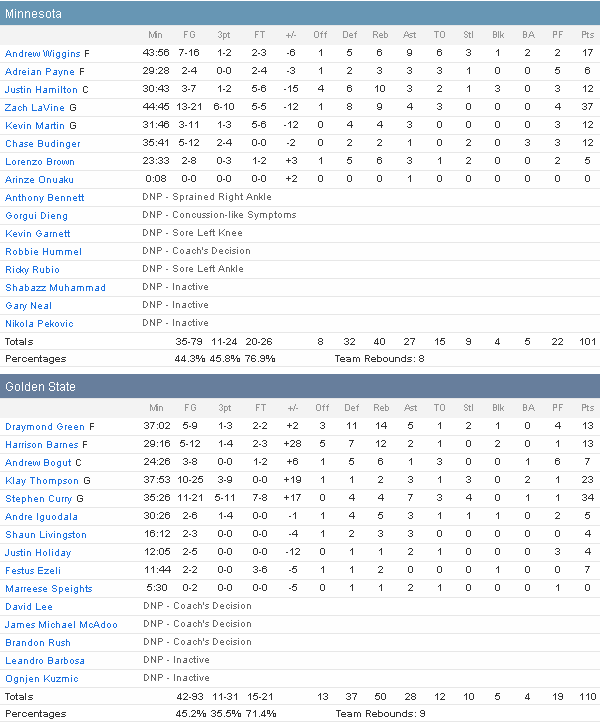 Stephen Curry a inscrit 20 de ses 34 points (dont 5/11 à trois points) en première mi-temps et Klay Thompson a ajouté 23 points à 10/25 dont trois tirs à trois points décisifs en fin de rencontre. Les Californiens sont tombés sur des jeunes Wolves accrocheurs, menés par leur duo de rookie Andrew Wiggins et Zach LaVine. Le second a sorti son meilleur match en carrière avec 37 points à 13/21 dont 6/10 à trois points et 9 rebonds alors que Wiggins signe 17 points à 7/16 et 9 passes.