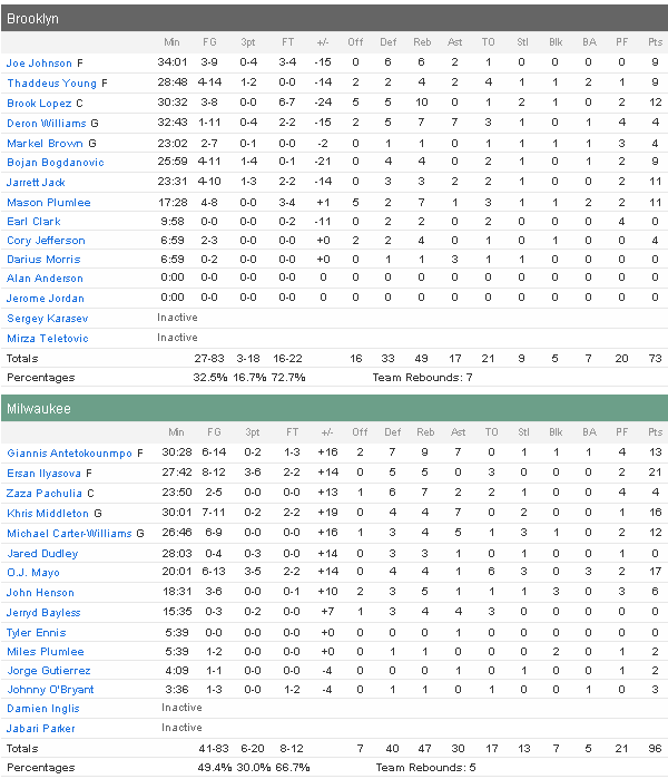Brooklyn s’est écroulé en seconde mi-temps en inscrivant seulement 32 points, contre 53 aux locaux. Brooklyn a connu une soirée catastrophique au niveau de l’adresse, pas aidé par une solide défense de Milwaukee. Ils ont shooté à seulement 32.5% dont un 3/18 à trois points, en plus de 21 ballons perdus. Les Bucks ont rentré 49.4% de leurs shoots dans le sillage du trio Ersan Ilyasova (21 points à 8/12), Khris Middleton (16 points à 7/11 et 7 passes) et OJ Mayo (17 points à 6/13). Giannis Antetokounmpo noircit lui la feuille de match avec 13 points, 9 rebonds et 7 passes alors que Michael Carter-Williams signe 12 points et 5 passes. Excellents depuis quelques temps, Brook Lopez (12 points à 3/8) et Deron Williams (4 points à 1/11) ont été parfaitement contenus par les joueurs de Jason Kidd.