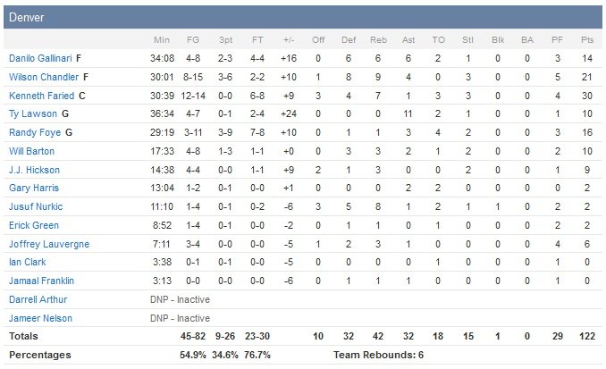 Denver prend rapidement 14 points d’avance mais Sacramento (27V-53D) revient pour prendre trois points d’avance en fin de première mi-temps. Les Nuggets parviennent finalement à reprendre les commandes à la pause, 60-59. Faried marque 9 points dans le troisième quart-temps pour aider son équipe à repasser la barre des 10 points, 94-84. C’est ensuite au tour de Chandler de prendre le relais avec 7 points pour démarrer le quatrième quart-temps et faire l’écart, 103-88. À noter que Denver (30V-50D) jouait sans Jameer Nelson (hanche) et Darrell Arthur (mollet).