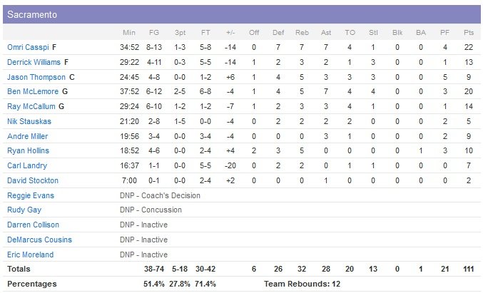 Pour leur dernier match à la maison, les Nuggets (qui ne dépassent pas les 50% de victoires au Pepsi Center pour la première fois depuis la saison 2002-03) ont également eu le droit à 21 points et 9 rebonds de Wilson Chandler. Côté Kings, Rudy Gay et DeMarcus Cousins ayant été mis au repos jusqu’à la fin de saison, c’est Omri Casspi (22 points) qui termine meilleur marqueur sans empêcher une troisième défaite consécutive de son équipe et un 8e revers en 9 rencontres.