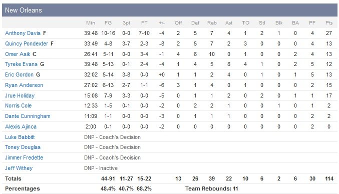 Anthony Davis marque lui 27 points à 10/16, 7 rebonds, 4 passes et 2 interceptions et son équipe est toujours bien en course pour la 8e place de la Conférence Ouest, avec un bilan identique à celui d’Oklahoma City avec le tiebreaker en poche. New Orleans compte 10 points d’avance en première mi-temps après un 3-points de Quincy Pondexter (13 points) à 4 minutes et demi de la pause. Houston (54V-26D, 6e de la Conférence Ouest derrière Memphis) marque néanmoins les 10 points suivants avec des 3-points de Jason Terry (12 points) et Harden pour égaliser à 48 partout. Les Pelicans enchaînent sur un 7-4 pour mener 55-52.