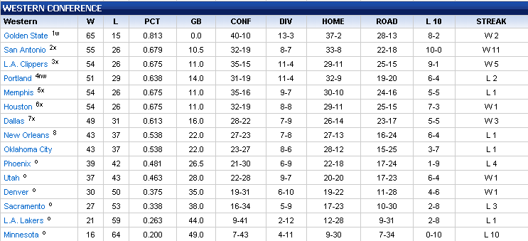 Avec les derniers résultats des Spurs, Rockets, Clippers et Grizzlies, la situation à l’Ouest pour les places de 2 à 6 ne s’est pas décantée et tout reste encore très flou. On sait juste que les Blazers termineront 4ème et que le classement actuel est le suivant: