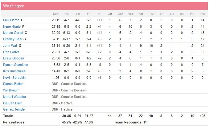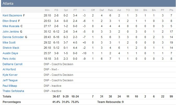 Washington, qui affrontera Toronto ou Chicago au premier tour des playoffs, conclut donc sa saison à domicile sur une série de 29V-12D, mieux que le 22V-19D de l’année dernière. Atlanta n’avait de son côté rien à perdre dans ce match et Mike Budenholzer avait laissé au repos tous ses joueurs majeurs, laissant la place à Dennis Schröder, John Jenkins, Kent Bazemore, Mike Muscala et Elton Brand dans le cinq majeur.